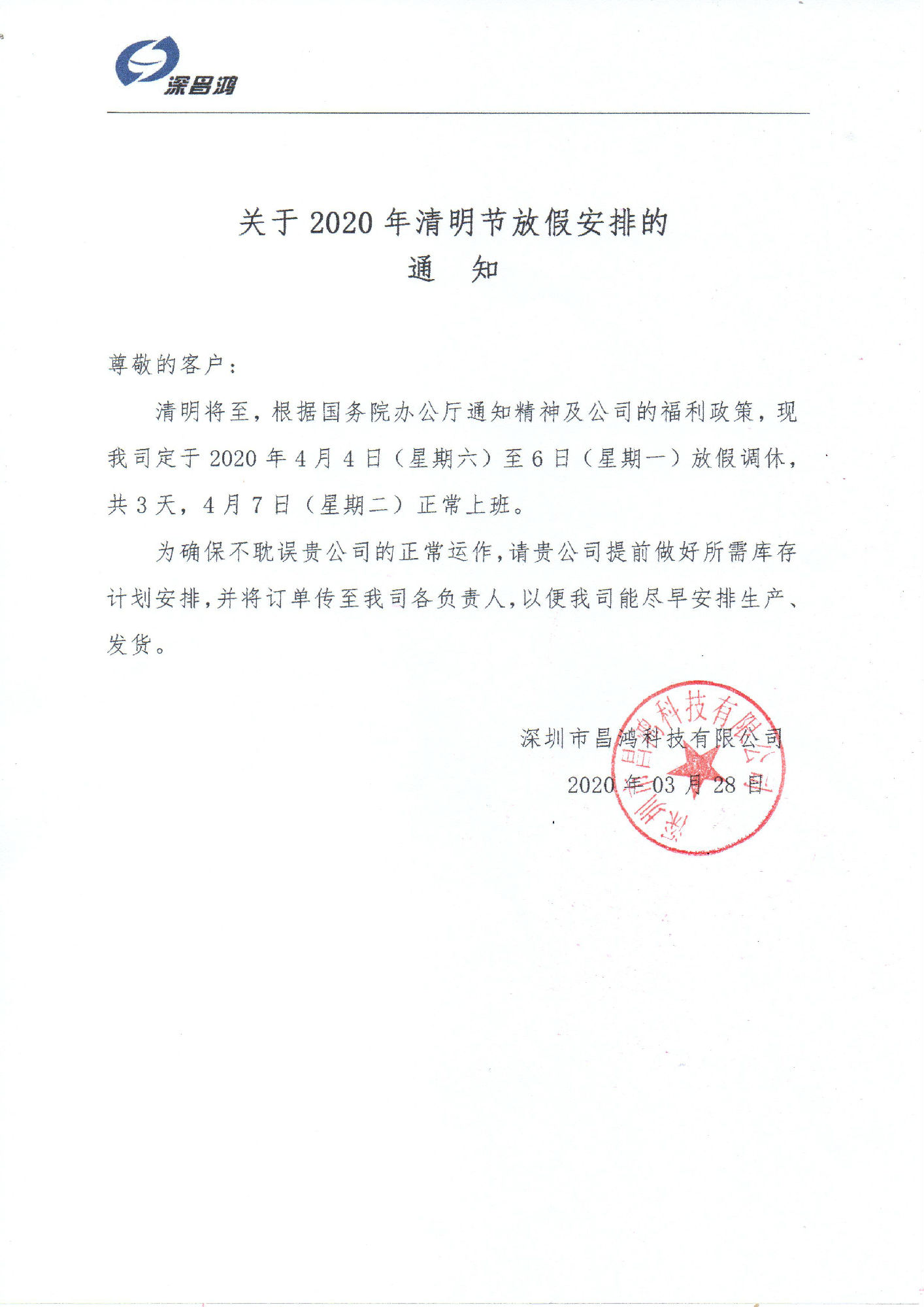 清明將至,根據(jù)國務院辦公廳通知精神及公司的福利政策,現(xiàn)我司定于2020年4月4日(星期六)至6日(星期一)放假調休,共3天,4月7日(星期二)正常上班。