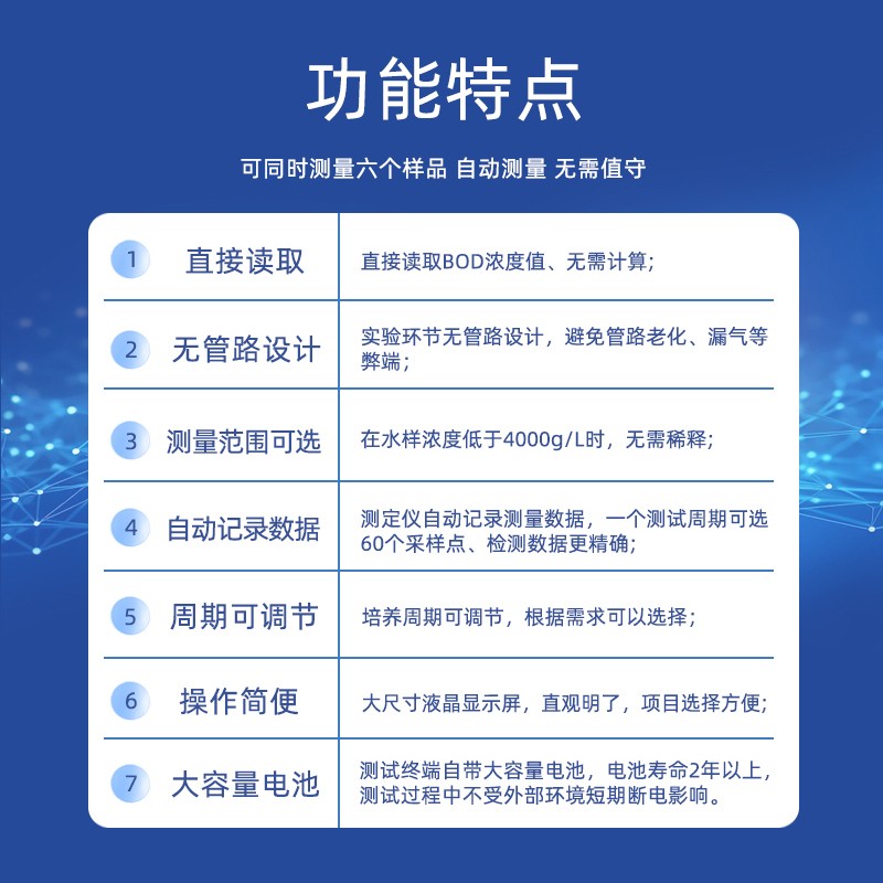批量處理 | 6份水樣/次 | 測(cè)量周期 | 1天~30天 |