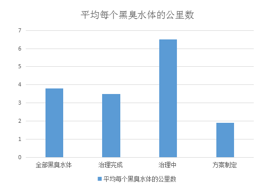 由此,我們對比了治理中、治理完成、方案制定和總的黑臭水體的平均每個的公里數(shù),即下圖: