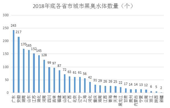 下圖為依據(jù)全國城市黑臭水體整治監(jiān)管平臺數(shù)據(jù)而來的2018年各省市城市黑臭水體數(shù)量圖: